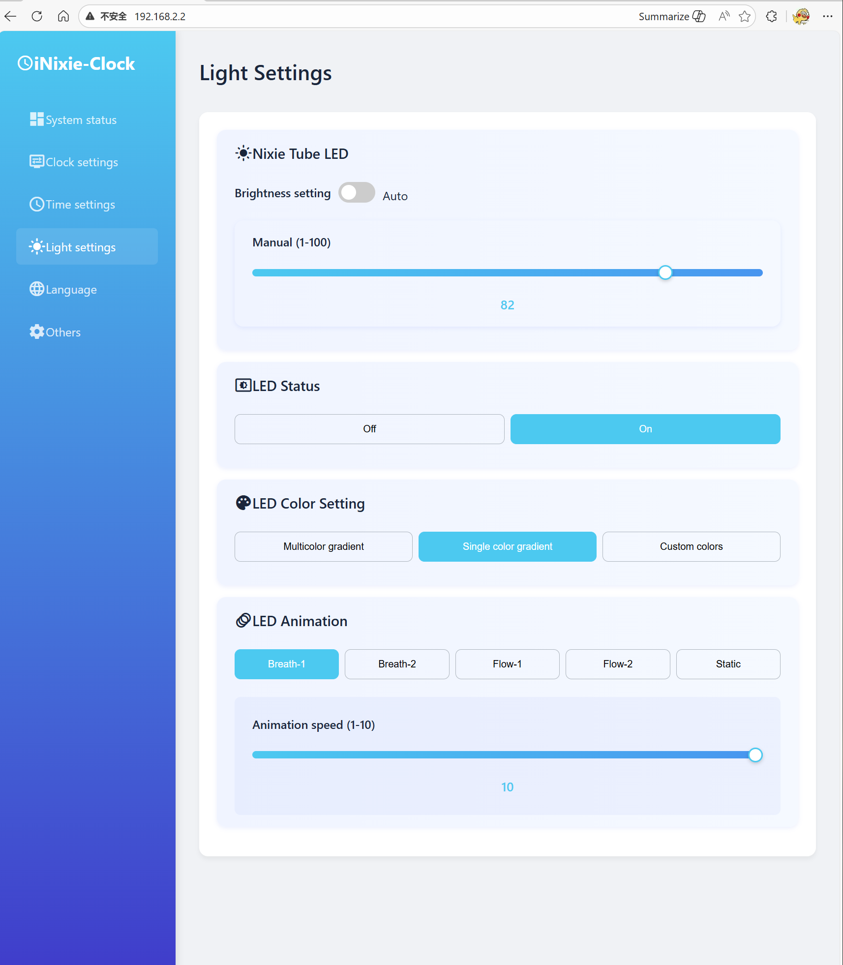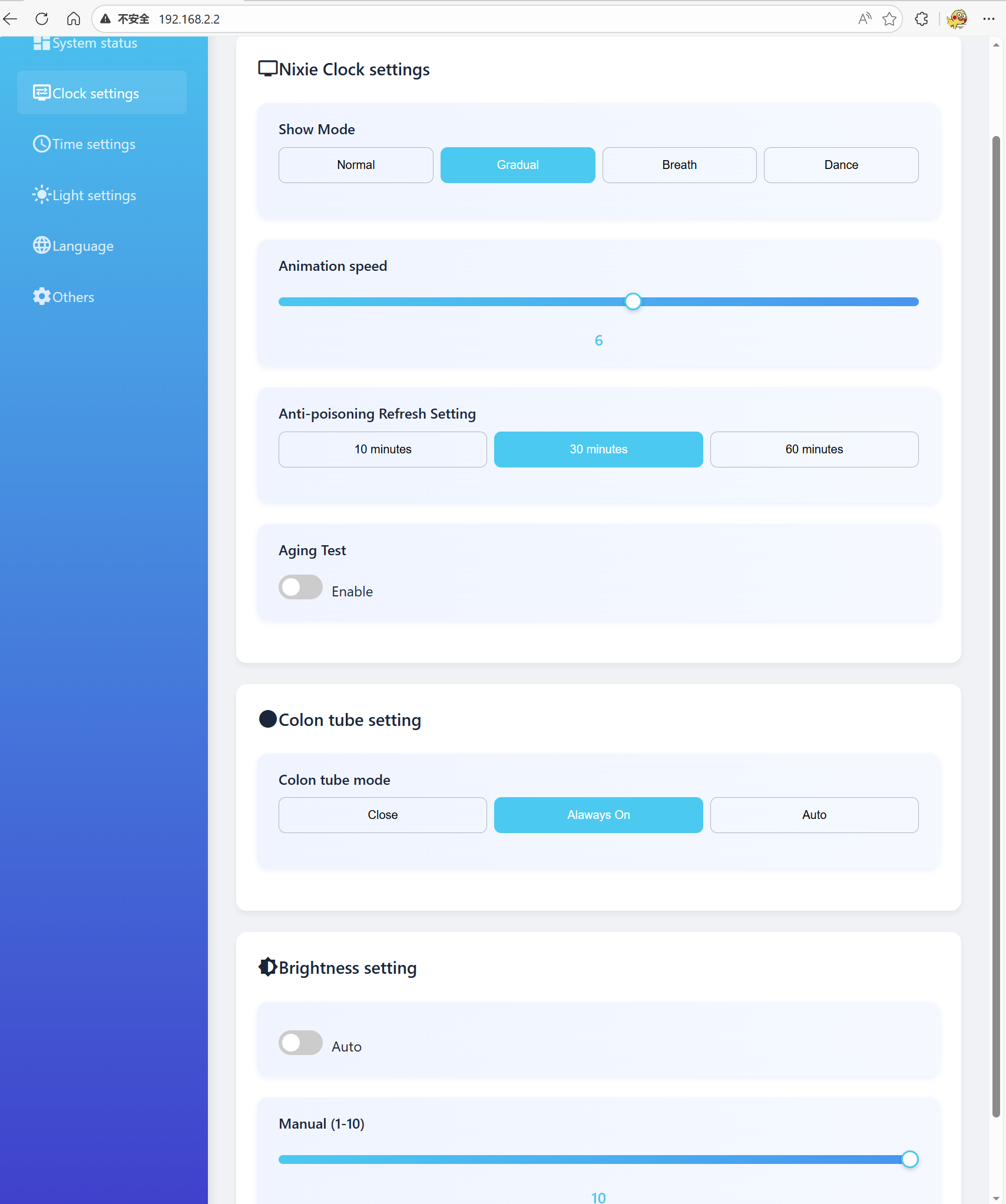 We offer four types of nixie tube display animations that can be freely switched. The clock also features a refresh function to extend the neon tubes' lifespan. Additionally, it supports adjusting the colon tube display style, automatic brightness, manual brightness, and more.