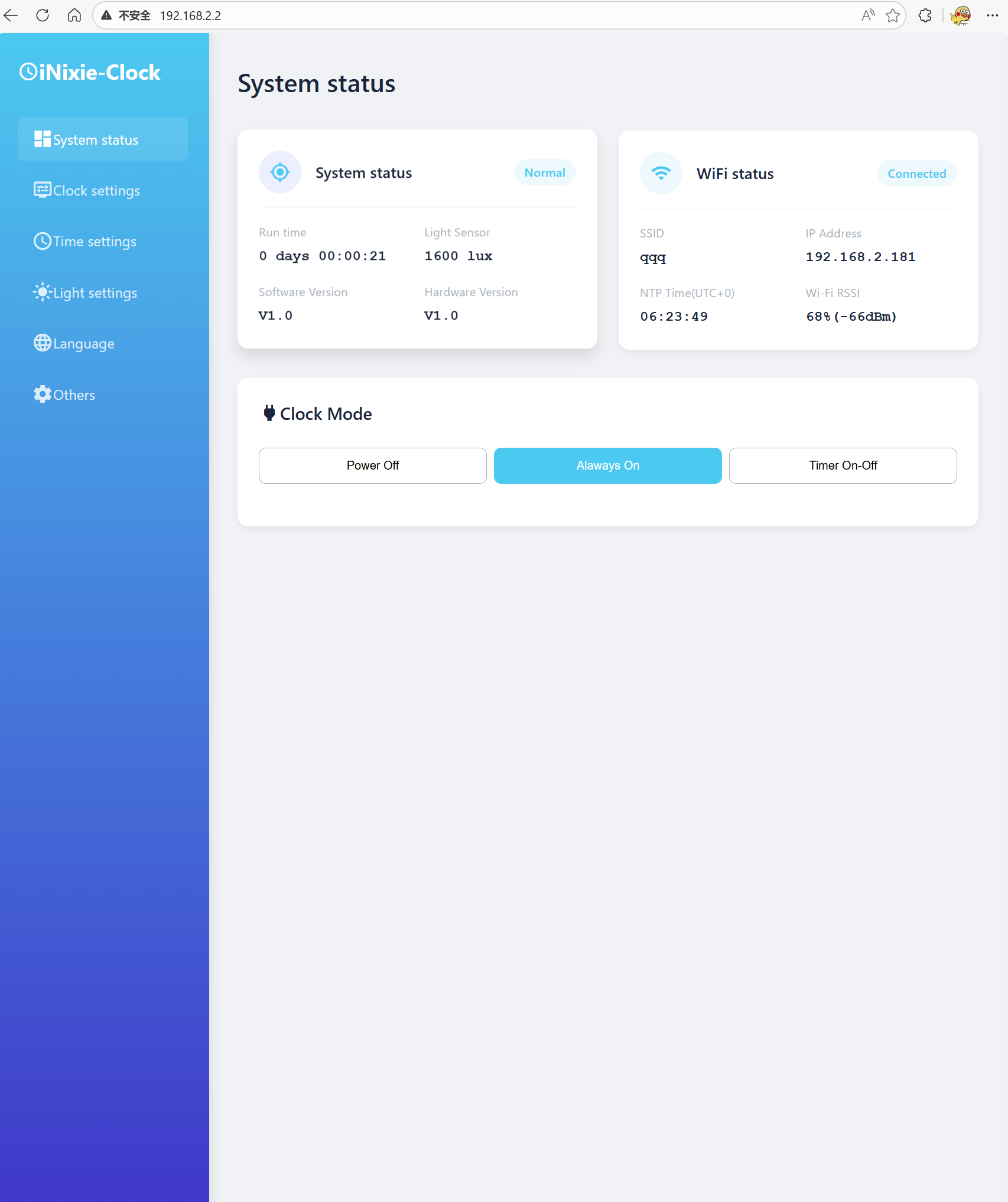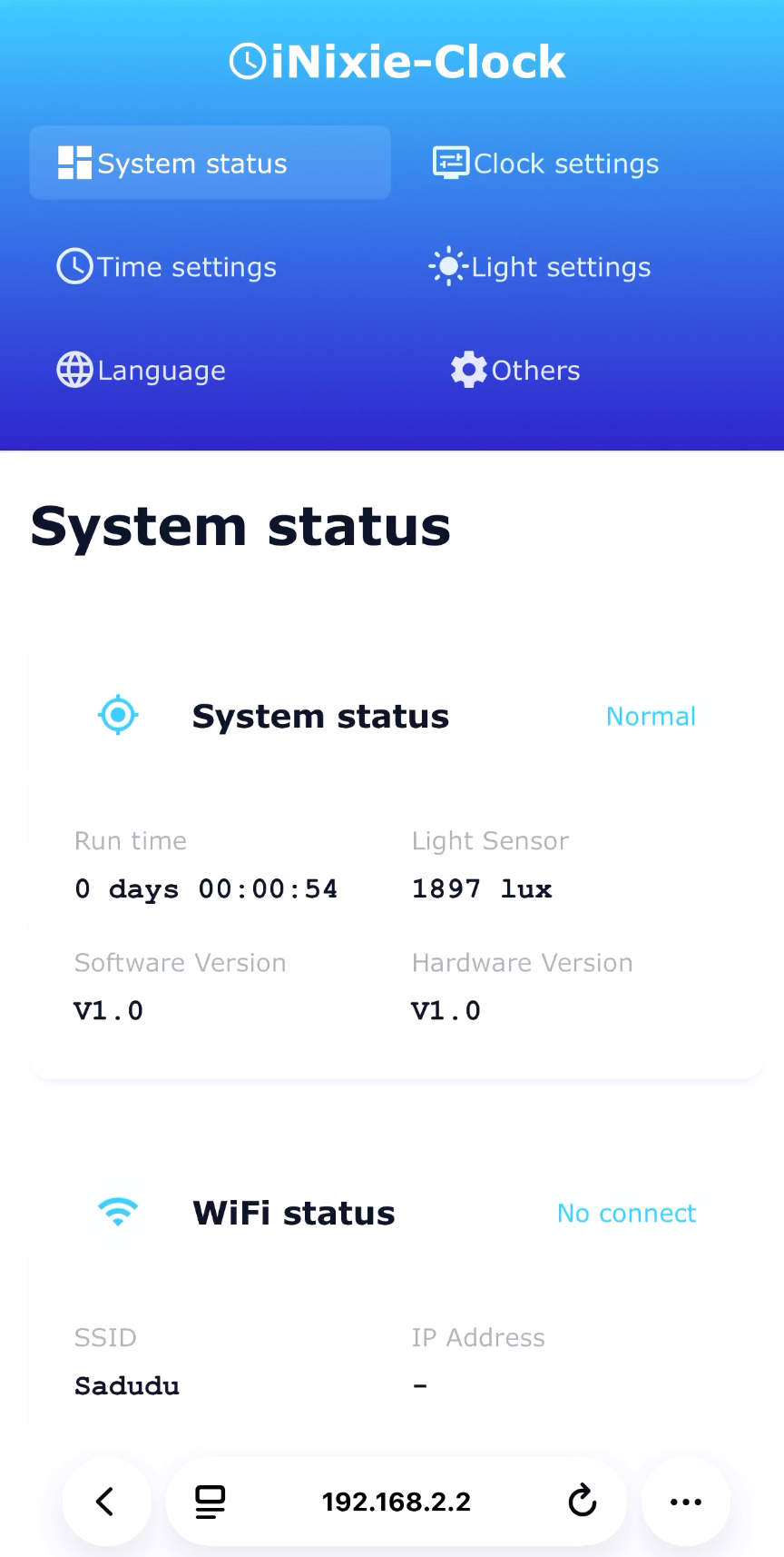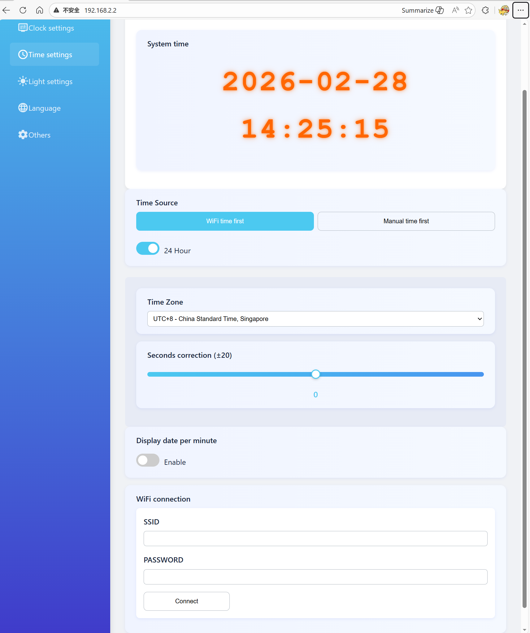 We have designed an Wi-Fi Web server to control the clock. On the Website, you can customize the power on/off times, display modes, adjust brightness, and so on. We also offer five LED presets for you, but of course, you can also customize the color. Clock synchronisation over Wi-Fi networks can be done with the iOS/Android/PC.